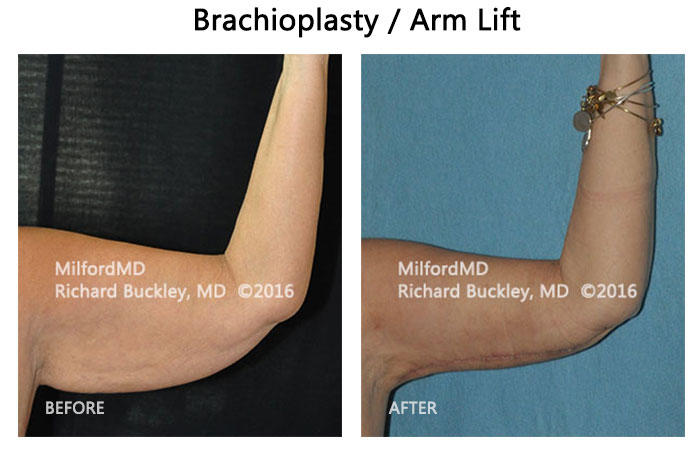 Brachioplasty (or upper arm lift) is performed to surgically eliminate loose, hanging skin from the upper arms. Aging and significant weight loss can lead to a loss of skin elasticity. Our surgeons will evaluate your upper arms to assess the amount and location of the fatty tissue as well as the degree of skin laxity. In patients with relatively good skin tone, liposuction or non-invasive skin tightening may be all that is recommended for contour improvement. If the skin is loose and has poor tone, an arm lift is the only procedure that will lead to a significant contour improvement. Liposuction is commonly performed prior to Brachioplasty to maximize the aesthetic result.
